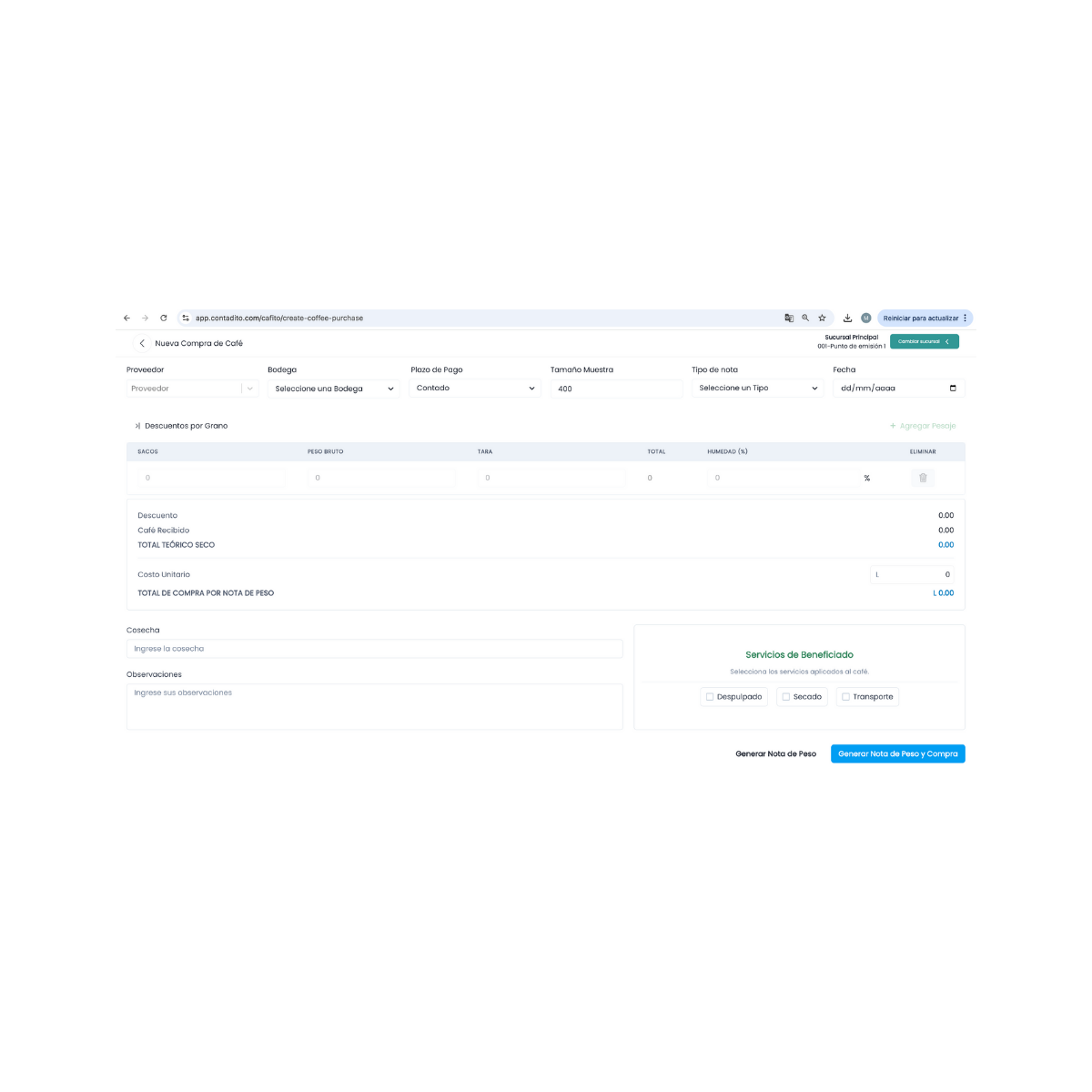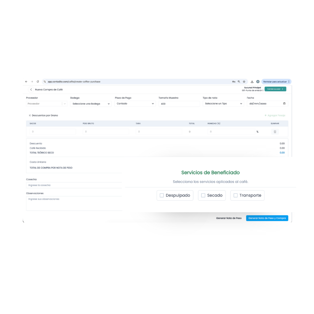 Control contable y operativo de la compra de café por medio de nota de peso, asegurando precisión y registro automático