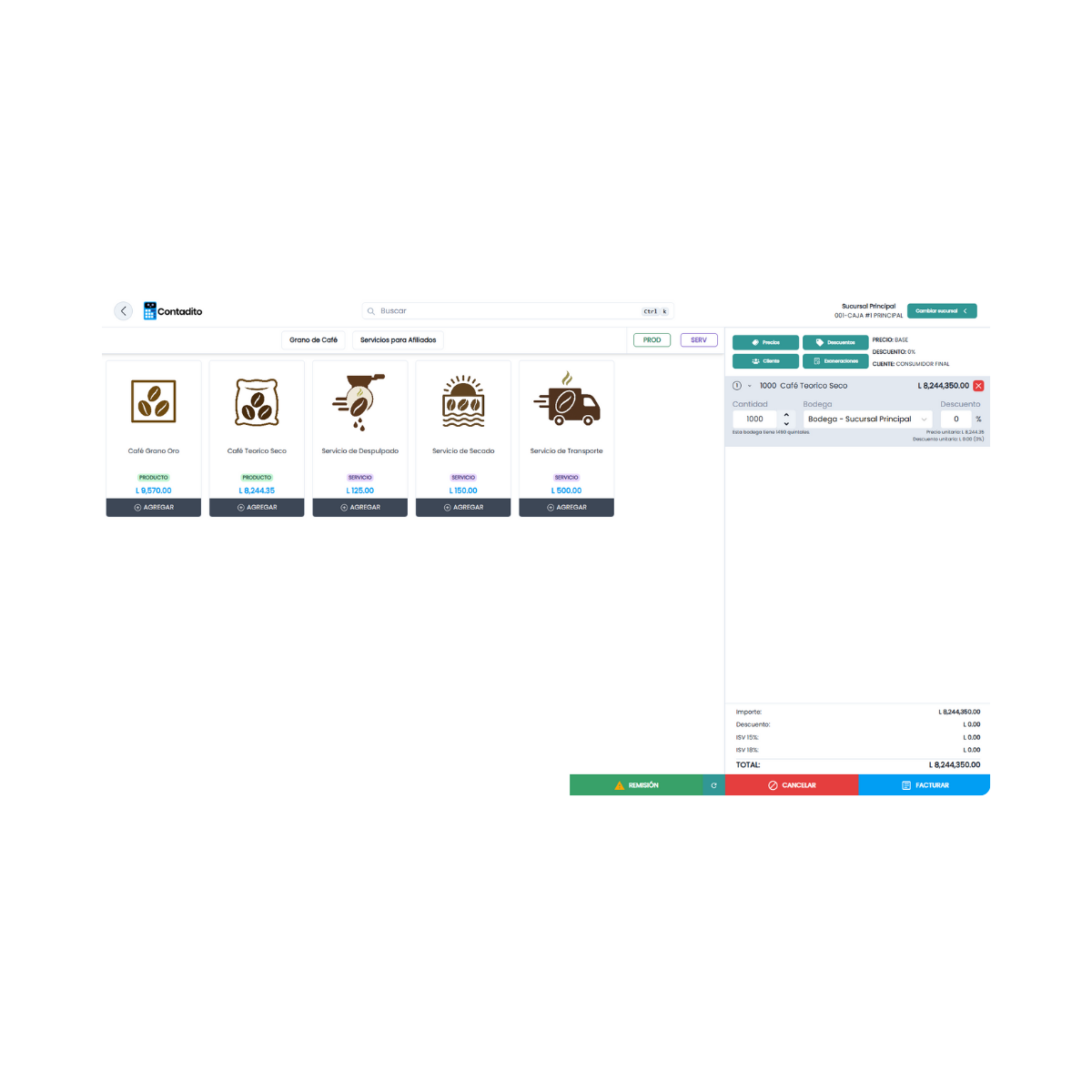 Gestión integral de las ventas de café teórico seco o grano oro, con emisión de guías de remisión y manejo de transportistas vinculados.